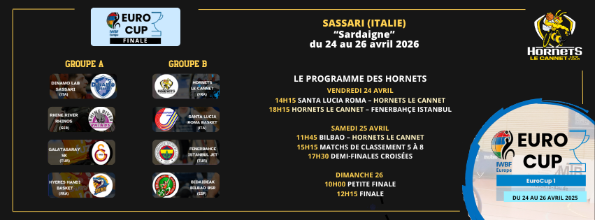 EuroCup 1 à Sassari en Sardaigne du 24 au 26 avril 2026 Après leur récent sans faute au tour de qualif en Autriche, début février, les Hornets vont devoir élever encore un peu plus leur niveau car cette fois-ci les adversaires auront le niveau « Champions League ». En effet, parmi ces 8 candidats à la couronne…